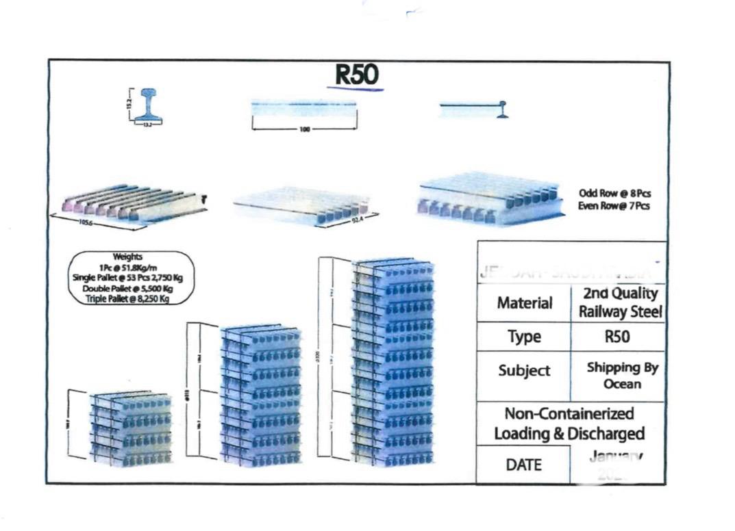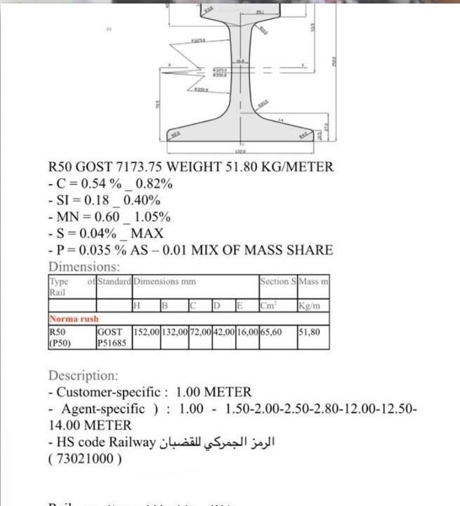 R50 railway steel, second quality rail, scrap rail R50, used railway steel, iron and steel industry, carbon steel rail, GOST 7173.75, R50 R65 rails, Baghlaf Steel, railway material export, steel re-rolling, metal recycling, ASTM E415