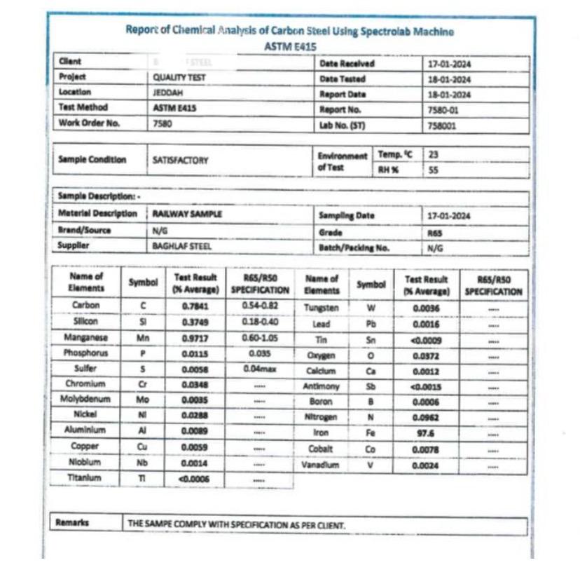 | Supplier Certification | Baghlaf Steel – 2024 Reports | Conforms to GOST 7173.75 and ASTM A751 |