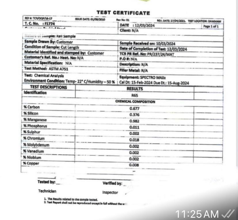 | Chemical Analysis | ASTM E415 – Spectrolab / Spectro MAXx | Composition meets R50 / R65 rail steel standards |